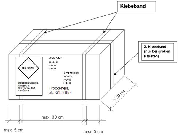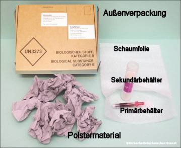 Die hier aufgeführten Verpackungsvorschriften gelten nur für den Versand von Proben ins Ausland, die der UN 3373 – Biologischer Stoff, Kategorie B – unterliegen. (Kategorie B und nicht infektiöses Material).