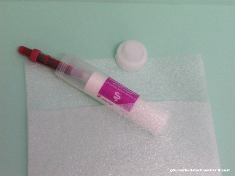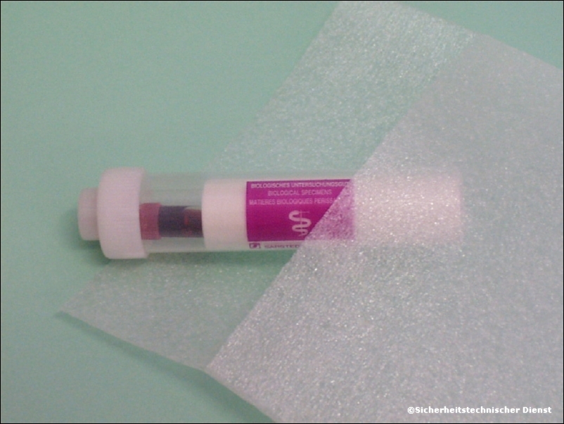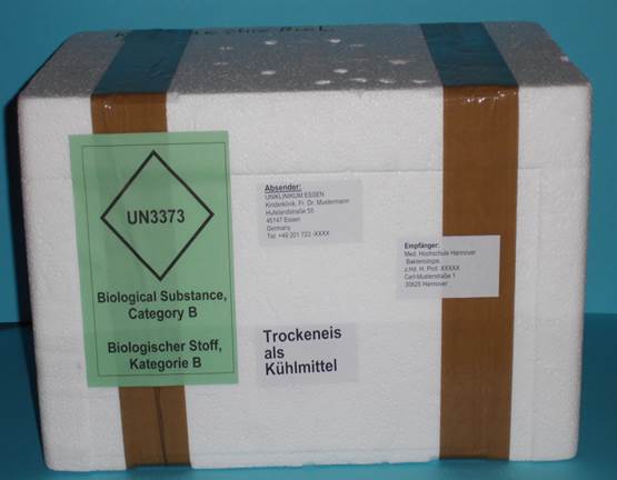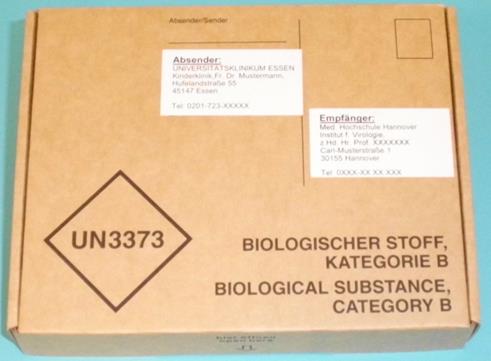 (Im Universitätsklinikum Essen müssen auch die nicht infektiösen Materialien und die Patientenproben als „Biologischer Stoff, Kategorie B“ – UN 3373 – verpackt und transportiert werden.)